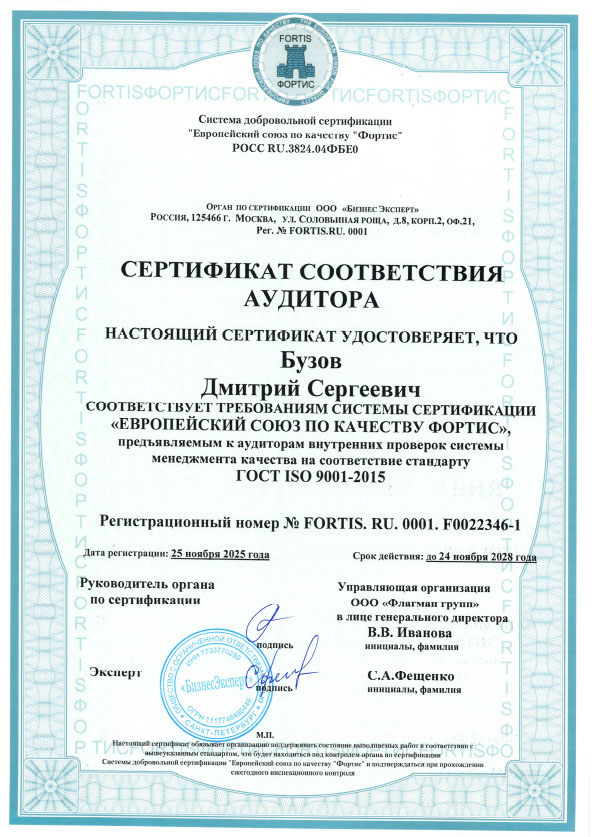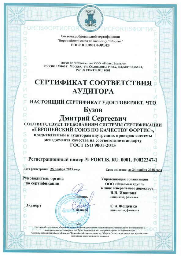 Сертификат соответствия системе сертификации "Европейский союз по качеству Фортис": Бузов Д. С.