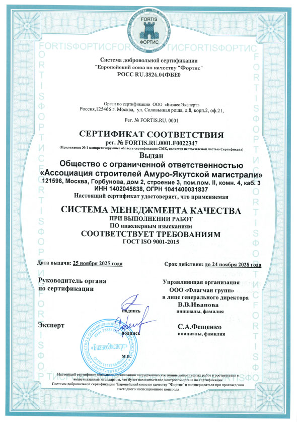 Система менеджмента качества при выполнении работ по инженерным изысканиям соответствует требованиям ГОСТ ISO 9001-2015